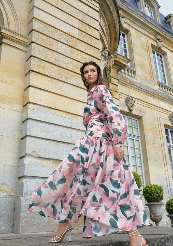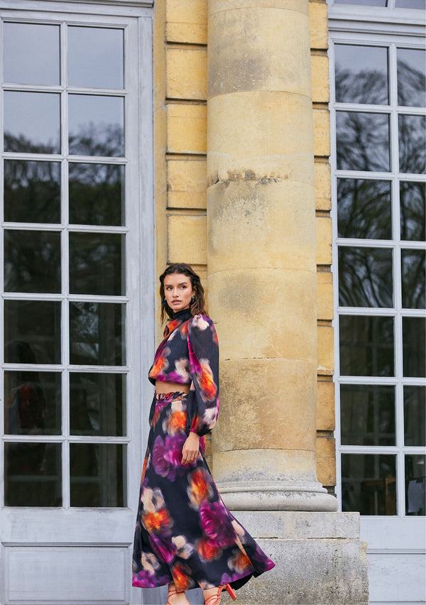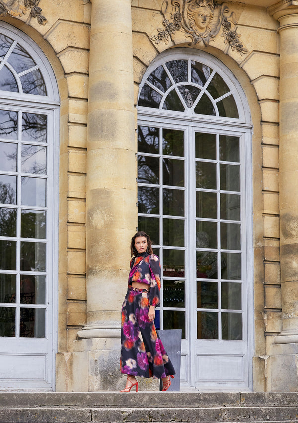 A colour palette rich in romantic shades and jewel tones are brought to life against the backdrop of the château. Deep plums to peacock blues, bright azure and lipstick red play across both monochromatic looks and prints. Winter's take on florals, paisley and an abstract marble swirl add excitement to your cold-weather wardrobe.